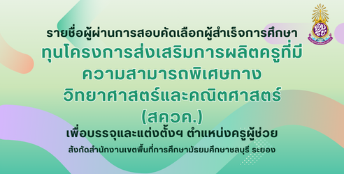 สพม.ชลบุรี ระยอง ประกาศรายชื่อผู้ผ่านการสอบคัดเลือกผู้สำเร็จการศึกษาทุนโครงการส่งเสริมการผลิตครูที่มีความสามารถพิเศษทางวิทยาศาสตร์และคณิตศาสตร์ (สควค.) เพื่อบรรจุและแต่งตั้งเข้ารับราชการเป็นข้าราชการครูและบุคลากรทางการศึกษา ตำแหน่งครูผู้ช่วย