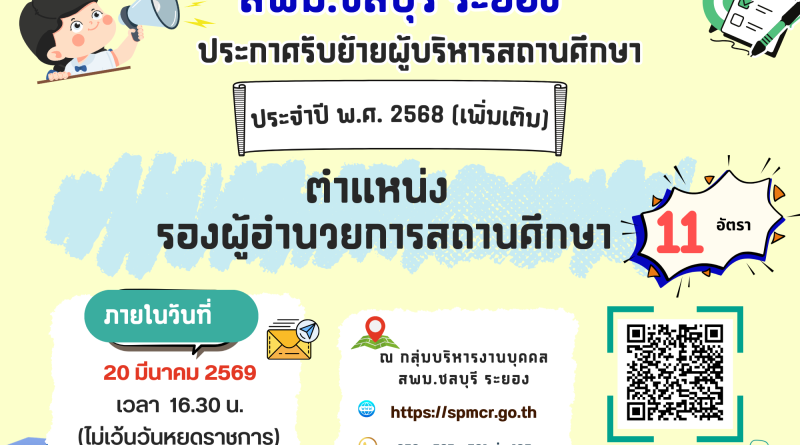 สพม.ชลบุรี ระยอง ประกาศรับย้ายผู้บริหารสถานศึกษา ประจำปี พ.ศ. 2568 (เพิ่มเติม) ตำแหน่งรองผู้อำนวยการสถานศึกษา